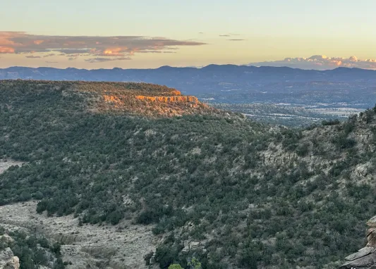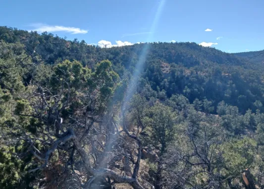 The Reynolds property comprises 280 acres, located 28 miles almost due north of Datil, New Mexico, as the crow flies. It is reached by a county-maintained dirt road (Forest Road 6A off of US 60) that connects to the Reynolds’ private dirt road. The rugged topography ranges in elevation from 7310’ to 7710’. It is blanketed by a pristine forest of piñon pines and junipers on the slopes and peaks, and scrub oak in the canyons. The forest is ancient: tree ring counts on some specimens exceed 700 years. Small meadows are open grasslands. The property is bounded by square mile sections of US Bureau of Land Management land on each of the north, west and south sides (1920 acres), which are accessible for study. Several neighboring landowners have also given access permission to Field Station participants for research and education, bringing the total area accessible for science to 2400 acres.